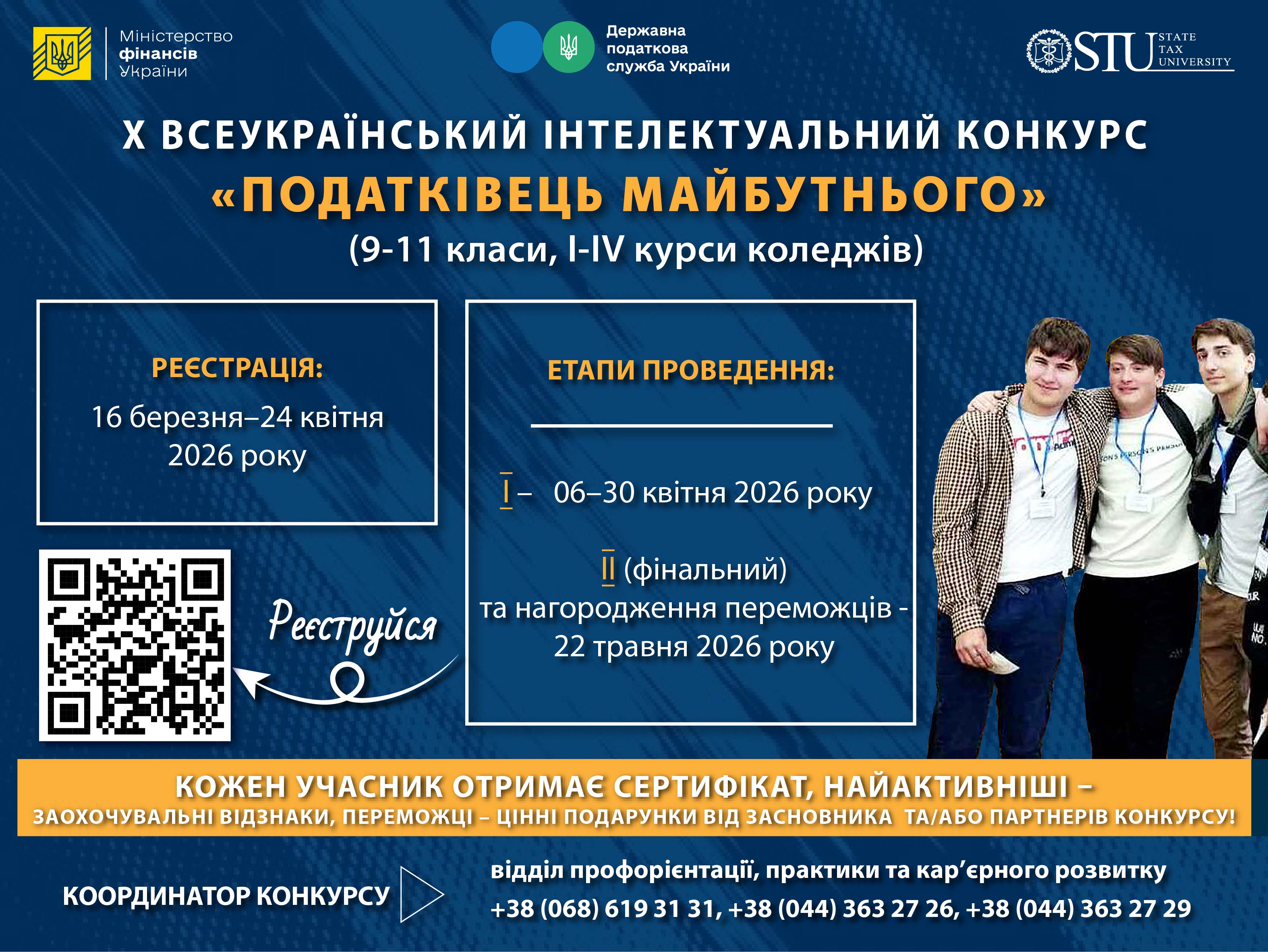 Стартував прийому заявок на участь у престижних інтелектуальних та мистецьких змаганнях, ініційованих Державним податковим університетом. Конкурси мають на меті виховання свідомого ставлення до сплати податків та налагодження партнерських відносин між податківцями та майбутнім поколінням.