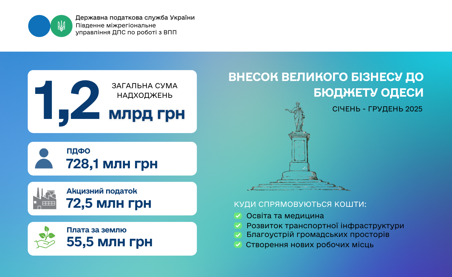 За січень–грудень 2025 року великі платники податків, які перебувають на обліку у Південному міжрегіональному управлінні ДПС по роботі з великими платниками податків, перерахували до бюджету міста Одеси понад 1,2 млрд гривень. Ці надходження забезпечили стабільне фінансування ключових напрямів життєдіяльності громади.