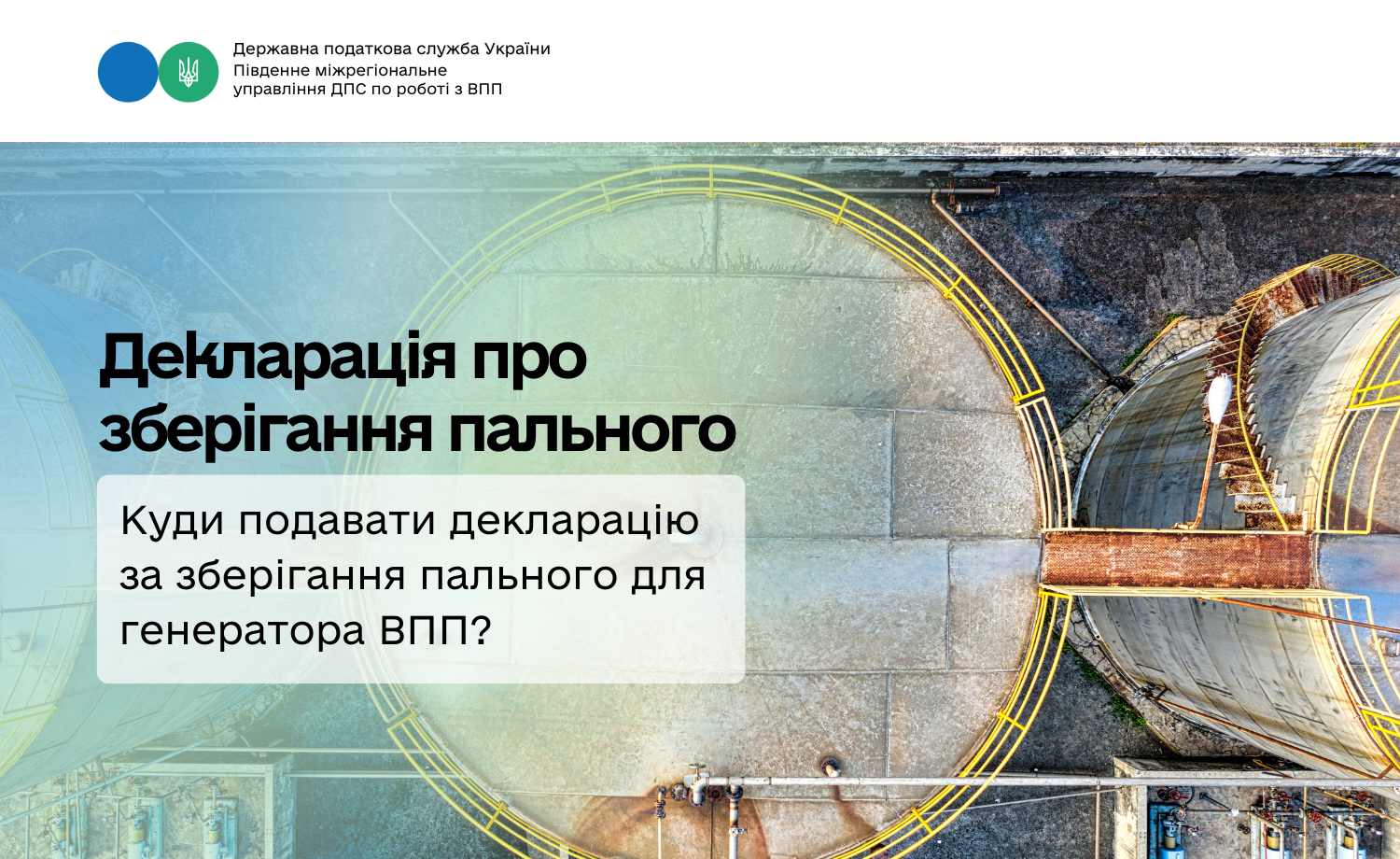 Пунктом 24 розд. XIII «Перехідні положення» Закону України від 18 червня 2024 року № 3817-ІХ «Про державне регулювання виробництва і обігу спирту етилового, спиртових дистилятів, біоетанолу, алкогольних напоїв, тютюнових виробів, тютюнової сировини, рідин, що використовуються в електронних сигаретах, та пального» встановлено, зокрема, що на період дії воєнного стану в Україні, введеного Указом Президента України від 24 лютого 2022 року № 64/2022 «Про введення воєнного стану в Україні», затвердженим Законом України від 24 лютого 2022 року № 2102-IX «Про затвердження Указу Президента України «Про введення воєнного стану в Україні», та протягом 30 днів з дня його припинення або скасування зберігання пального, яке споживається для заправлення електрогенераторної установки в обсязі понад 2000 літрів на кожному об’єкті, що забезпечений електрогенераторною установкою, здійснюється суб’єктом господарювання на підставі декларації про провадження господарської діяльності із зберігання пального (далі – Декларація), яка безоплатно подається до територіального органу центрального органу виконавчої влади, що реалізує державну податкову політику.
