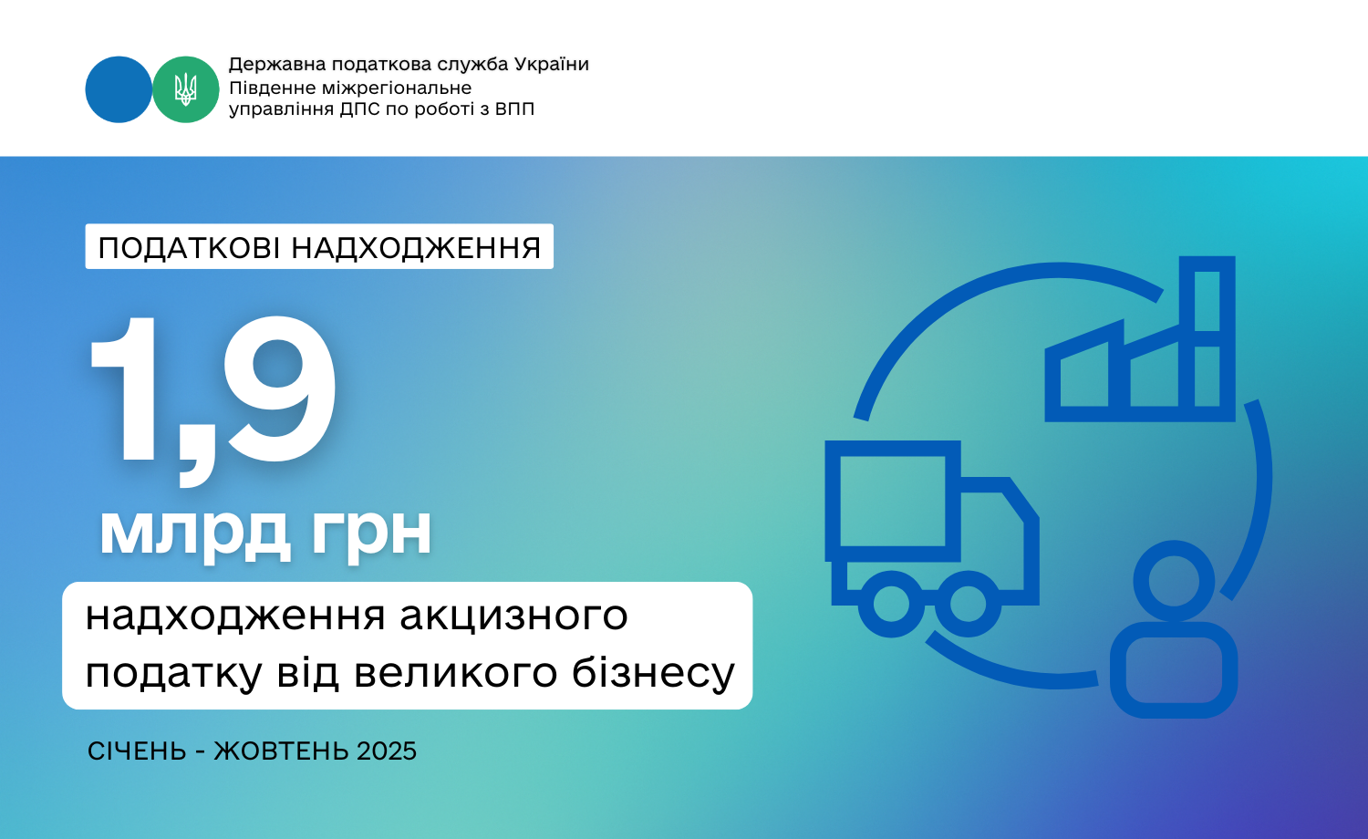У січні–жовтні 2025 року великі промислові підприємства Південного міжрегіонального управління ДПС по роботі з великими платниками податків сплатили до Зведеного бюджету України 1 млрд 932 млн грн акцизного податку, що на 90,5 млн грн більше ніж за відповідний період 2024 року.