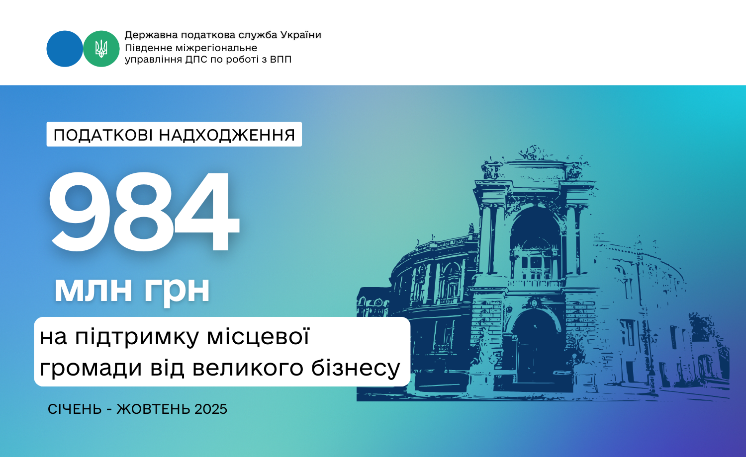 За десять місяців 2025 року великі підприємства, які перебувають на обліку в Південному міжрегіональному управлінні ДПС по роботі з великими платниками податків, перерахували до бюджету Одеси понад 984,4 млн грн.