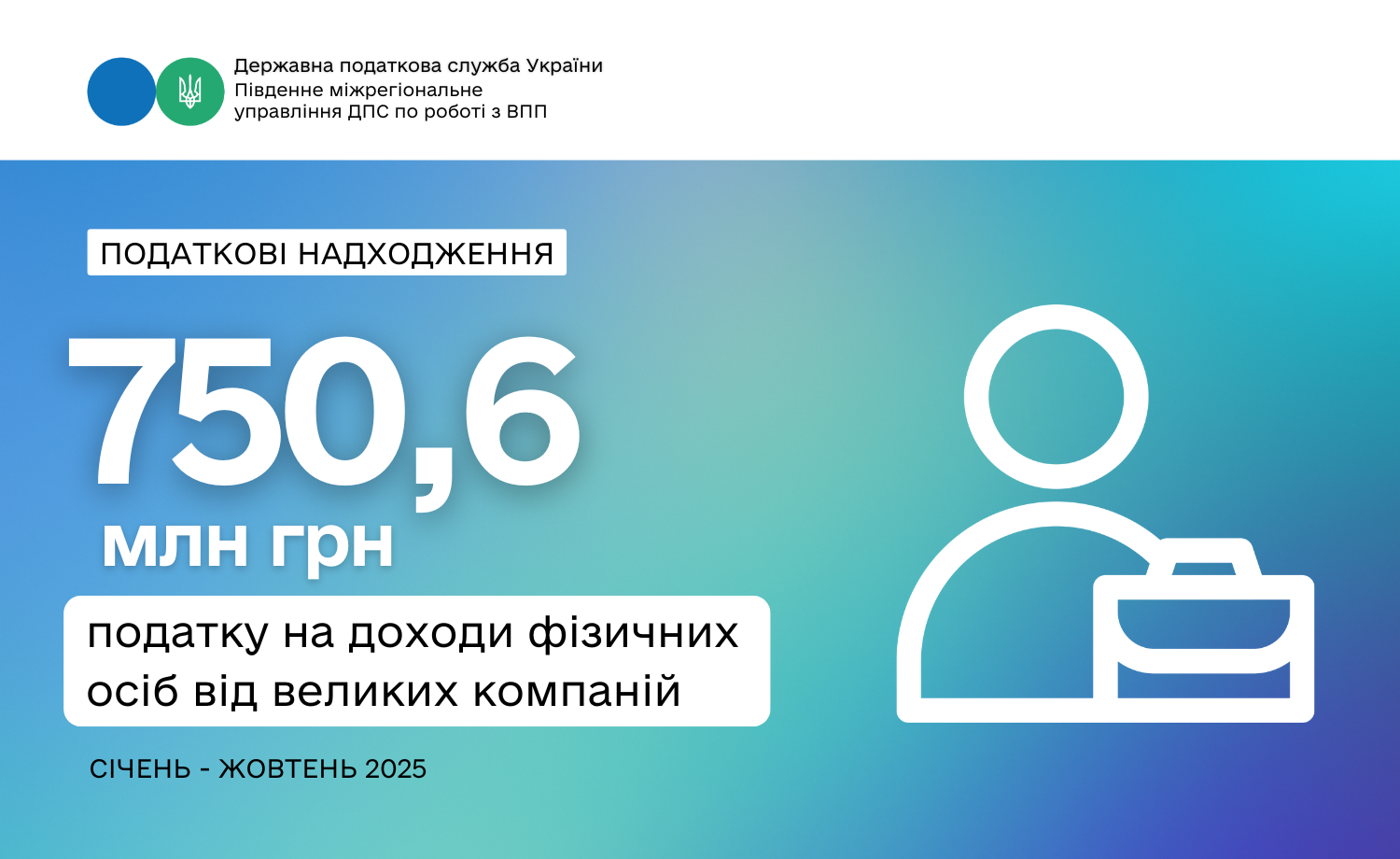Великі компанії, що перебувають на обліку у Південному міжрегіональному управлінні ДПС по роботі з великими платниками податків, продовжують демонструвати стабільність і соціальну відповідальність. За січень–жовтень 2025 року вони перерахували до бюджету 750,6 млн грн податку на доходи фізичних осіб (ПДФО).