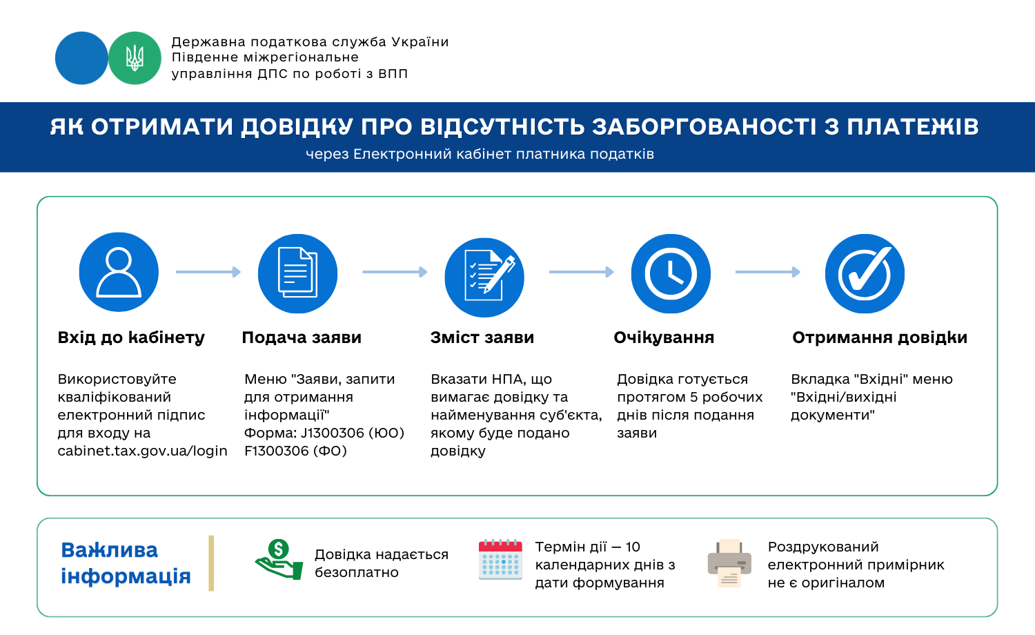 Згідно з абзацом першим п. 3 Порядку надання довідки про відсутність заборгованості з платежів, контроль за справлянням яких покладено на контролюючі органи, затвердженого наказом Міністерства фінансів України від 03.09.2018 № 733, для отримання довідки про відсутність заборгованості з платежів, контроль за справлянням яких покладено на контролюючі органи (далі – Довідка) платник подає заяву про надання довідки про відсутність заборгованості з платежів, контроль за справлянням яких покладено на контролюючі органи.