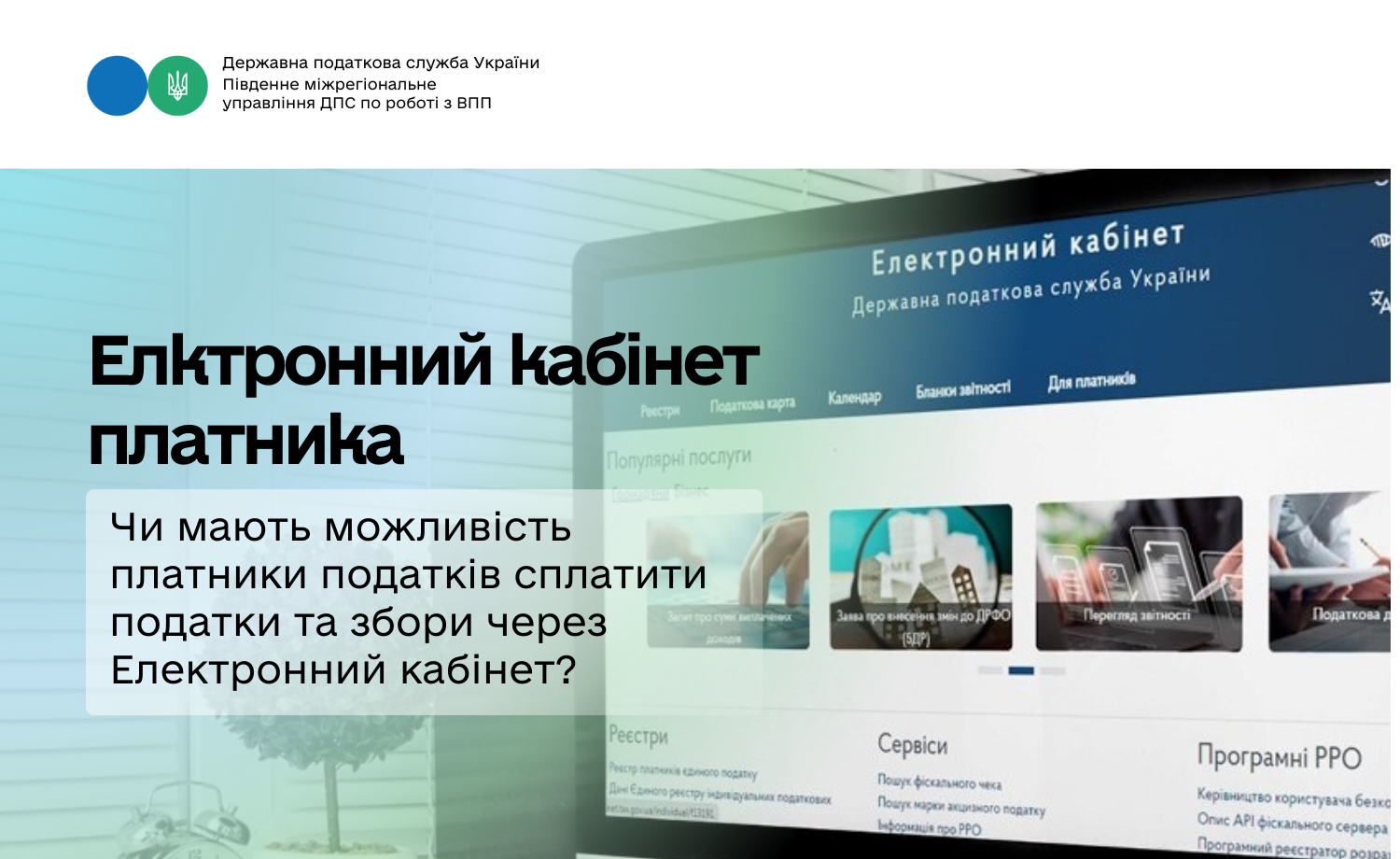 Меню «Стан розрахунків з бюджетом» приватної частини Електронного кабінету надає можливість фізичним особам після ідентифікації за допомогою платіжної системи сплатити податки, збори, платежі за допомогою платіжної карти або за допомогою QR-коду. Для юридичних осіб можливість сплати податків, зборів та платежів через Електронний кабінет не реалізована.