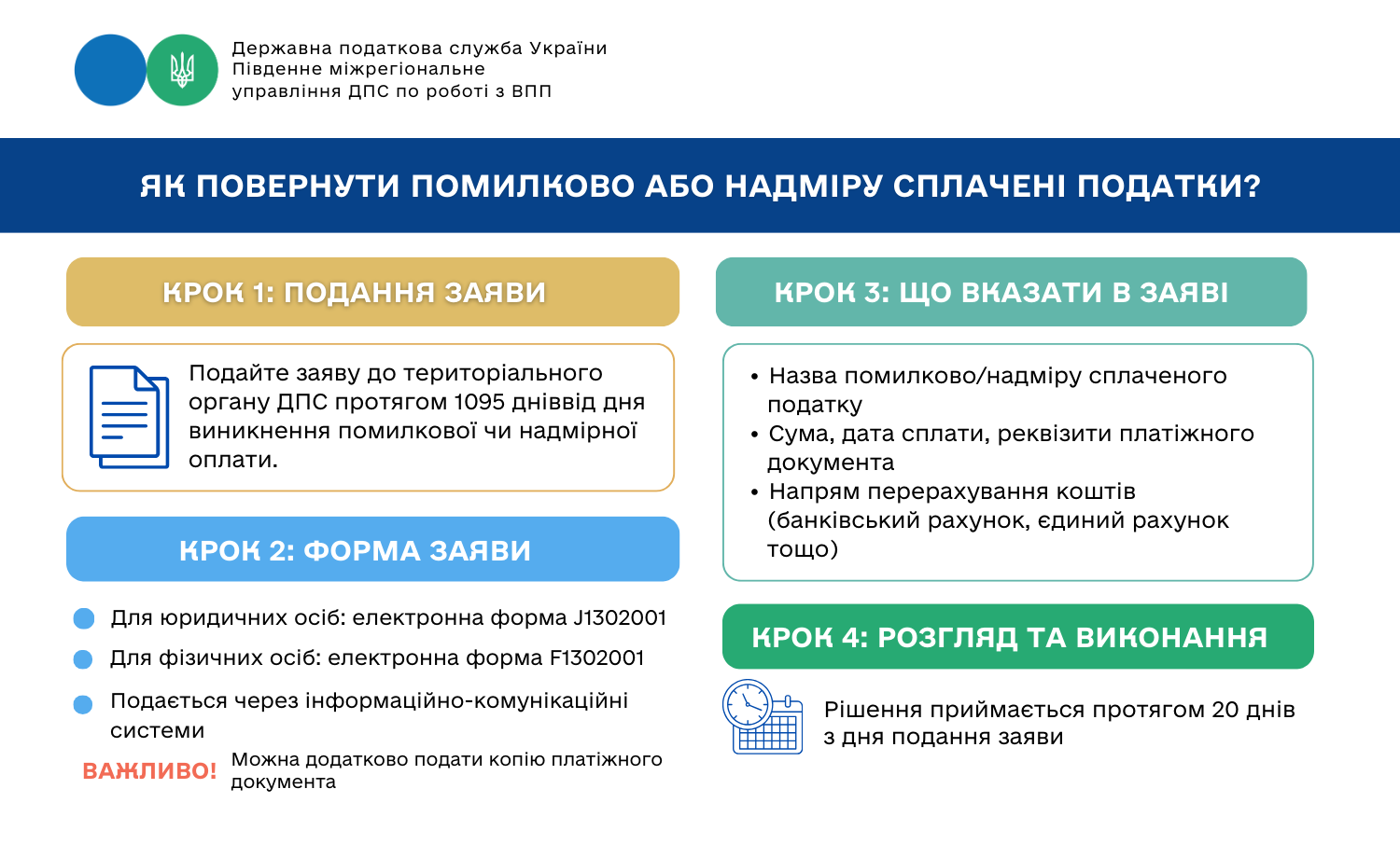 Південне міжрегіональне управління ДПС по роботі з великими платниками податків нагадує, що повернення помилково та/або надміру сплачених сум грошових зобов’язань та пені у випадках, передбачених ст. 43 ПКУ, здійснюється виключно на підставі заяви платника податку (крім повернення надміру утриманих (сплачених) сум податку на доходи фізичних осіб, які повертаються територіальним органом ДПС на підставі поданої платником податків податкової декларації за звітний календарний рік за результатами проведення перерахунку його загального річного оподатковуваного доходу, поданої до територіального органу ДПС за місцем адміністрування (обліку) помилково та/або надміру сплаченої суми протягом 1095 днів від дня її виникнення.