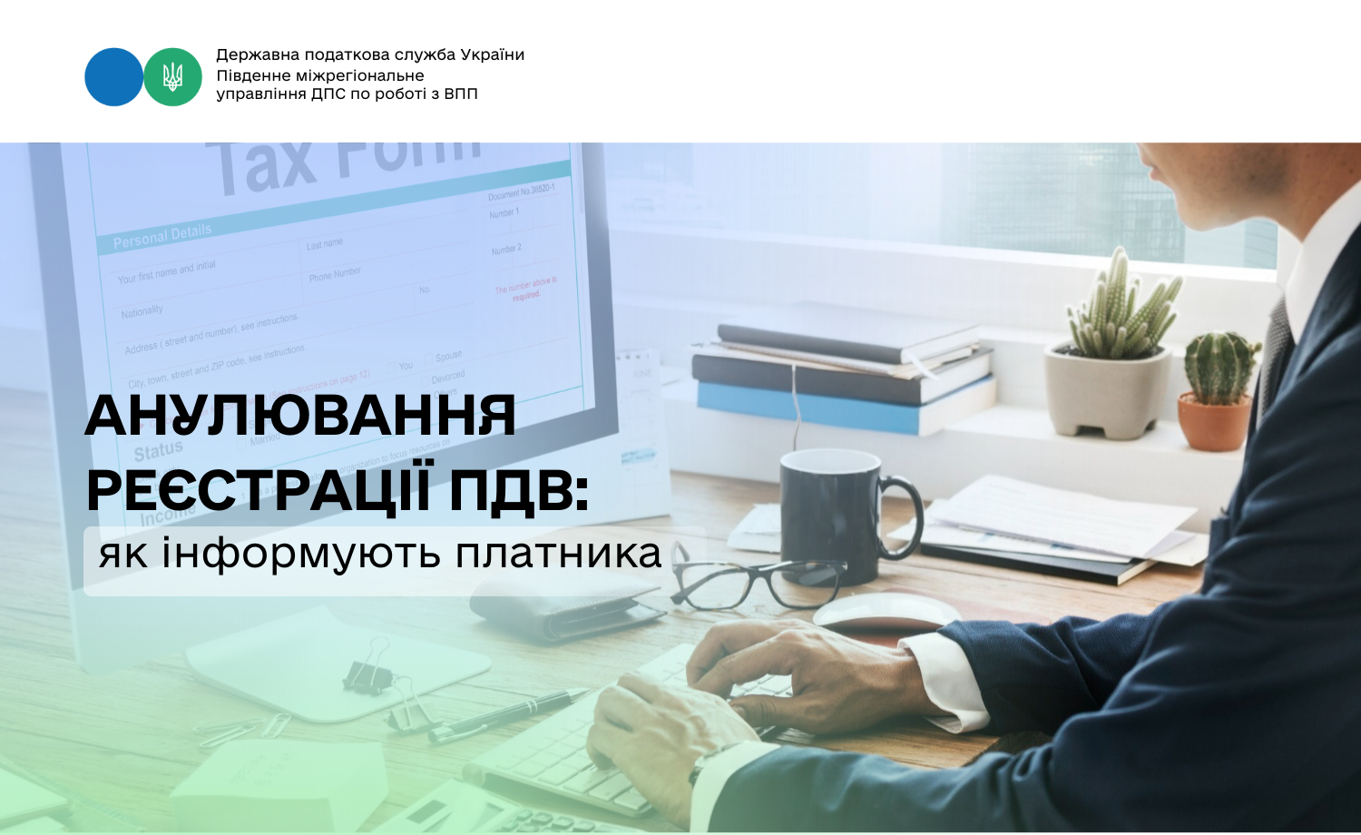 Пунктом 184.10 ст. 184 ПКУ визначено, що контролюючий орган, який прийняв самостійне рішення про анулювання реєстрації платника ПДВ, зобов’язаний письмово повідомити особу протягом трьох робочих днів після дня анулювання такої реєстрації.
