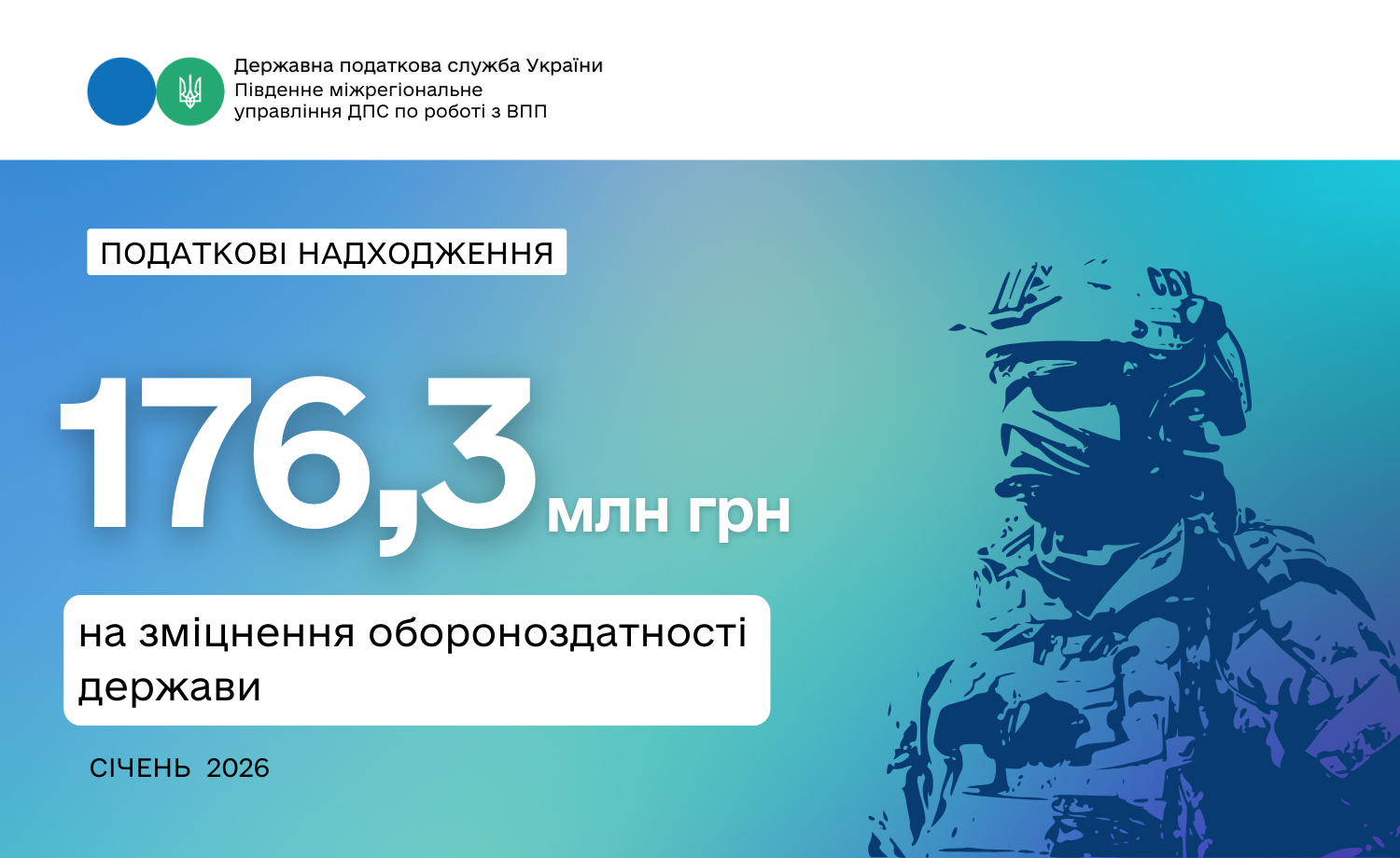 У січні 2026 року великі підприємства, які перебувають на обліку у Південному міжрегіональному управлінні ДПС по роботі з ВПП, забезпечили зростання надходжень військового збору до державного бюджету. Загальна сума сплаченого збору становила 176,3 млн грн, що на 20,7 млн грн більше, ніж у січні 2025 року.