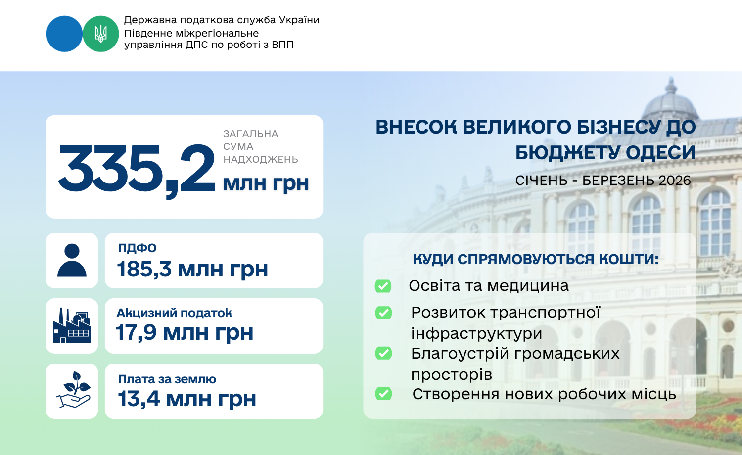 З початку 2026 року великі платники податків, які обліковуються у Південному міжрегіональному управлінні ДПС по роботі з великими платниками податків, спрямували до бюджету міста Одеси 335,2 млн гривень.